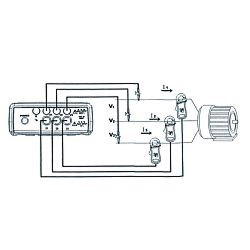 3. Sluit de 3 testsnoeren aan voor de spannings routes met L1, L2, L3 en de energieanalyser. Dan worden de ampèremeter tangen aangesloten, zoals op de afbeelding rechts te zien is, op de meter en het circuit.